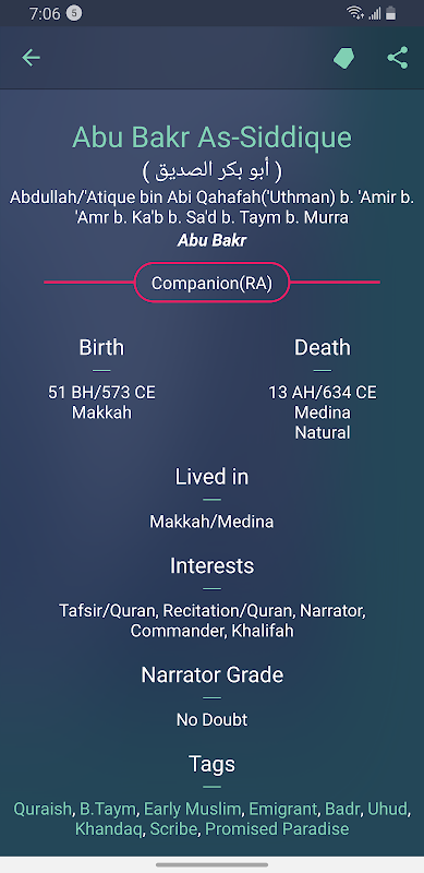 •诸如出生/死亡日期,居住地点,老师和学生的名单以及叙述者的等级/等级等信息提供了有关圣训叙述者的有用信息。[更多..]