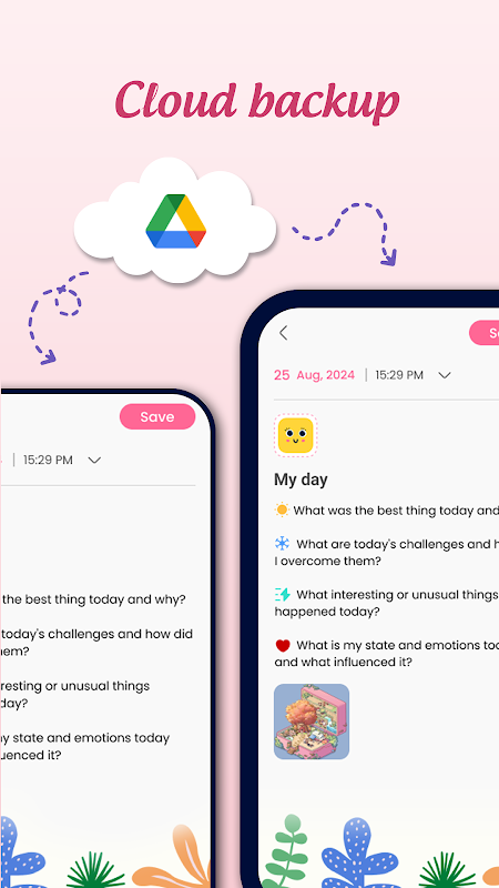 您将能够将日记同步到 Google 云端硬盘以确保安全,并让日记条目可以在不同设备上访问。