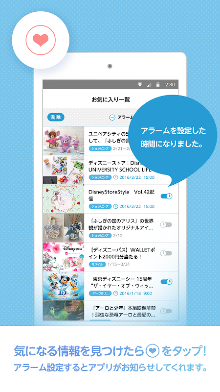 お気に入りに入れた情報は任意の時間にアラーム設定をすることができます。
