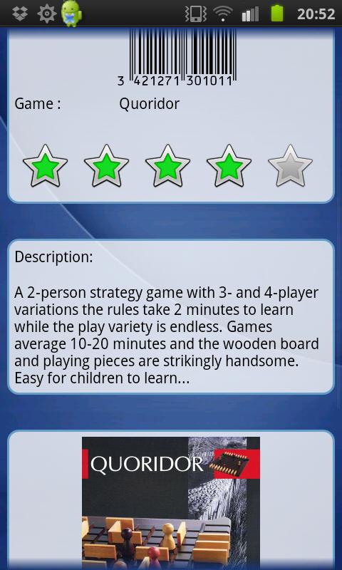 your mobile? This app is for you! With it you can san your differents games and retrieve the data from the different providers (Upc Data and google product, more will follow). You can take a photo of your games, put a rating, description, ...