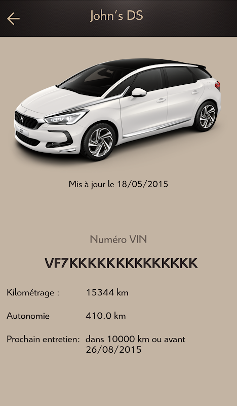L’application MyDS vous affiche un ensemble de services personnalisés : les alertes de véhicule, l’autonomie, le kilométrage et l’échéance d’entretien après chaque trajet vous permettant ainsi de mieux entretenir votre DS.