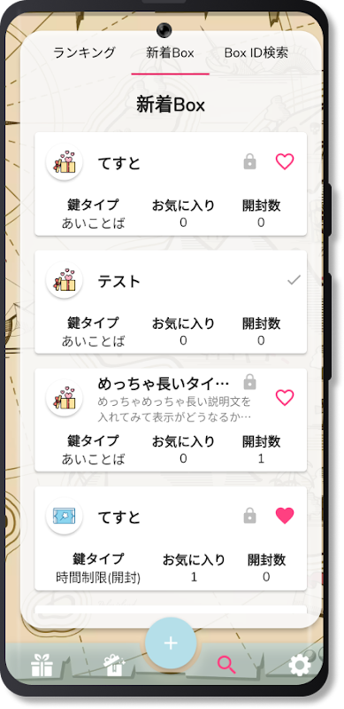 一般公開として作成したボックスは、すべてのユーザーが開封にチャレンジすることが出来ます。お気に入り数や、開封された数のランキングにも公開されるため、時間限定で不特定多数に公開したいメッセージや、謎解き要素を含んだボックスを作成しよう。