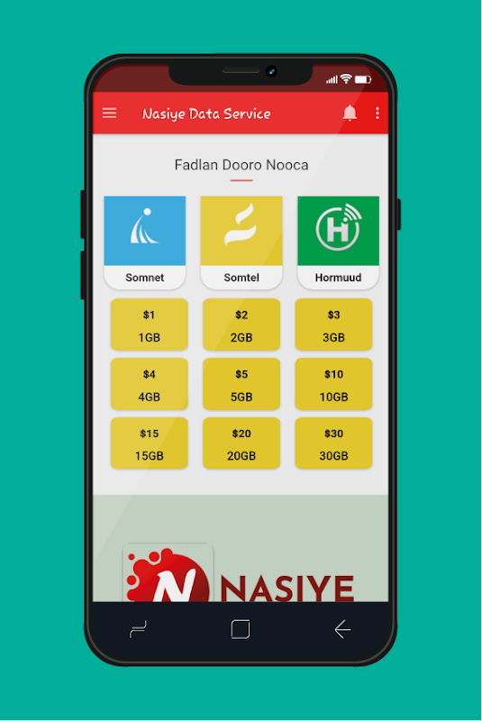 Waxaad ka iibsan kartaan xirmooyinka SomNet. Hada kadib uma baahnid in aad cid la hadashid ama qarash telefan ku bixisid si laguugu shubo xirmo SomNet hadii aad isticmaashaan Nasiye Data. Sidoo kale ka waxaad ka heli doontaa Adeegyada EVC Plus, ANFAC iyo Artimet