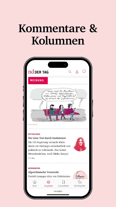 每天晚上 7:00 开始,可访问印刷报纸 nd.DerTag 和 nd.DieWoche 的所有文本以及我们的周一数字版。