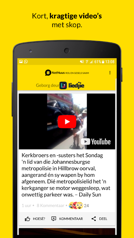 NetNuus is ‘n gratis, Afrikaanse nuus-app wat jou in 'n japtrap op hoogte bring van die jongste nuus waaroor almal praat. Die app is gemaak vir die van ons wat nuus vinnig wil lees, niks wil mis nie en nie verlore raak nie. Dis nuus wat saak maak: raakgevat. Wanneer iemand jou vra: "Het jy gehoor?"... het jy dit waarskynlik reeds op NetNuus gelees. Die app bied ‘n gerieflike leeservaring – wat ons die gewildste Afrikaanse nuus app in Suid-Afrika gemaak het. Het jy iets op die hart? Wat dink jy oor wat in die nuus gebeur? Sê jou sê of reageer met ‘n gesiggie – maak soos jy smaak. Met regstreekse kennisgewings (“push notifications”) verseker die app dat jy geen stories misloop nie. Dis rolnuus vir almal.