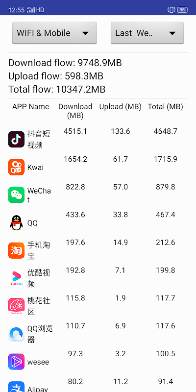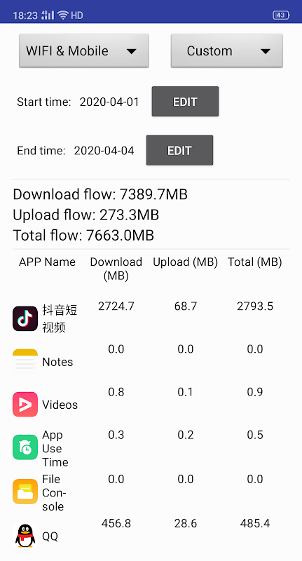 这是一个针对网络数据流量使用情况监控的工具,它为您展示指定时间段内您所使用的数据流量总计以及每个APP所使用的数据流量总计。
