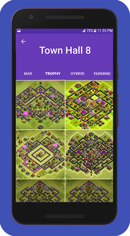 This is an Offline app that contains New Defensive Base Maps of COC village layouts from Town Hall 1 to Town Hall 11 with 4 category War, Trophy, Hybrid and Farming.