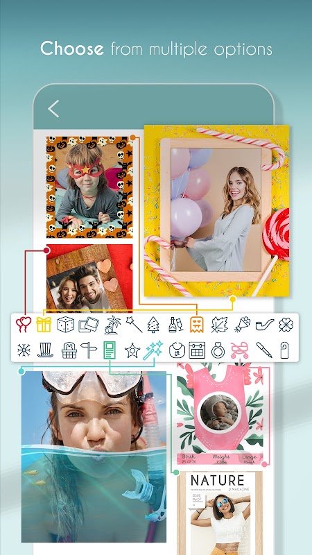 创建圣诞节、感恩节、2025 年新年、庆祝兔年、爱情和生日相框。这款应用可轻松使用手机中的贴纸拼贴,为您的特殊日子增添色彩