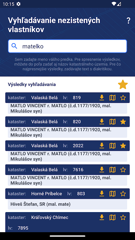 创建此应用程序的目的是为了简化在斯洛伐克土地基金 (SPF) 开始发布的未知所有者列表中的搜索。应用程序中使用的数据可在 SPF 的官方网站上公开获取。发布的数据为.csv 格式,分为多个文件。这些文件一起包含数百万条记录。对于普通用户来说,搜索这些文件既冗长又复杂。这就是我们创建此应用程序的原因。多亏了它,你可以在几分之一秒内轻松地在数百万数据中搜索你祖先的属性。