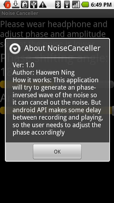 As the name suggest, this app will try to lower the environment noise by generating a phase-inverted wave of the noise. Due to a delay of sampling and playing(no realtime sound api in android), user will need to change the phase and amplitude manually to get the best effect.