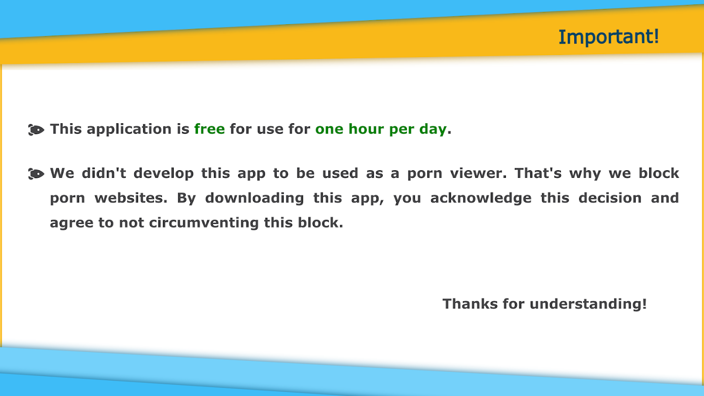 But we don't do porn ✋! We've noticed that a major fraction of the users use this app to .. you know (and we can understand why), but we wouldn't have developed this app if we knew this would be its #1 use-case. So, it's blocked. If this is the only reason you are looking at this app, don't bother. Or maybe, consider this an opportunity to replace useless habits. We've used this app as a distraction free environment to improve ourselves. Say, if you force yourself to watch online courses for half an hour a day, you can finish a course of average length every month 👨🎓. I bet you'd love to do that 😉!