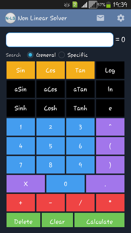 科学工具/求解器解决单变量非线性方程(NLS)。该应用程序可以计算出免入息审查的重根。该应用程序有两种不同的选择来计算NS即根。 (一)一般(B)具体。通用搜索选项提供免入息审查的根没有任何用户指定的限制(应该用于非编单根)。具体的搜索选项让用户指定范围内的根(应使用免入息审查多根找到重根有不同的限制)。结果可以通过使用发送到任何电子邮件ID“发送电子邮件”选项主菜单。The应用有着非常丰富和人性化的UI(用户界面)。