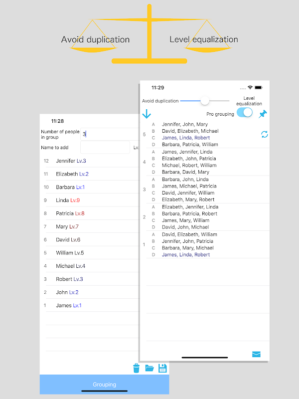 - 为每个成员输入级别(1到9),现在可以对组进行分组,使得级别的平均值可以更接近。