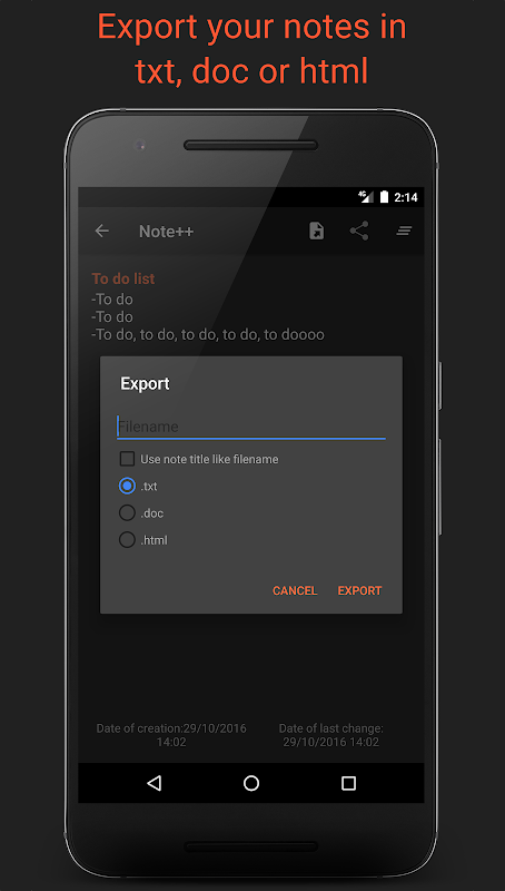 Note++ - simple, but very handy app. Create notes and lists, whenever and wherever. Worried that your thoughts and ideas see someone else? Hide them or protect with a password! Need quick access to a particular note? Create notification with this note! Share your notes with friends or export them to other file formats.