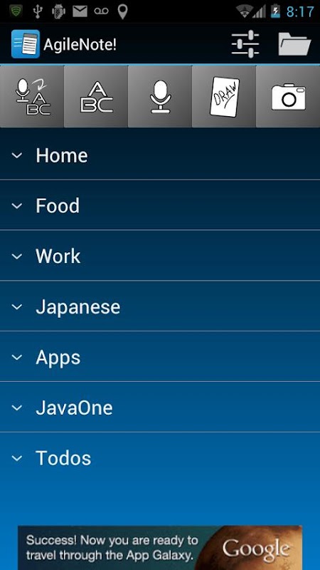 AgileNote! Beta is a multi-input notepad for Android 3+ that enables users to quickly take notes with many different input methods. You can create Voice Transcription notes, Text Notes, Audio Notes, Drawing Notes, and Photo Notes. Have a thought? Click and speak your idea to AgileNote! and have it transcribed to text. Need to draw something? Click and start drawing immediately. Think of some funny jokes? Click the text button and jot it down.
