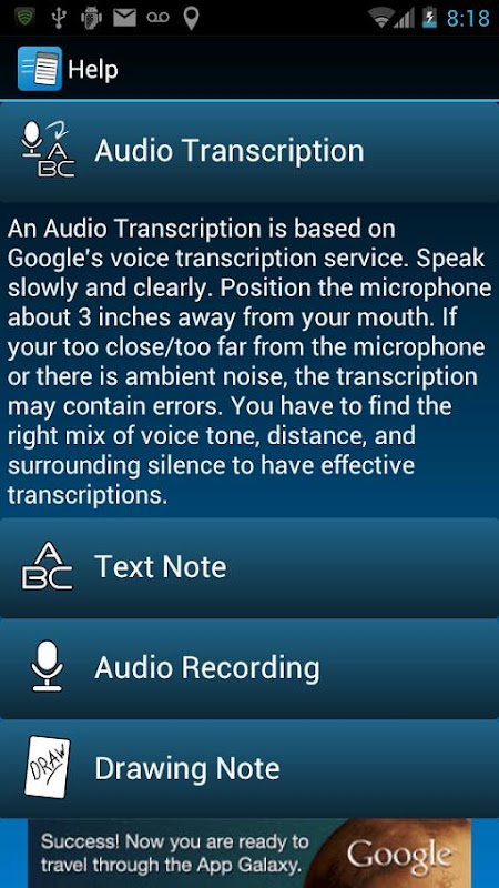 - Take notes 5 different ways! Voice Transcription, Text, Audio Recording, Drawing and Photo.