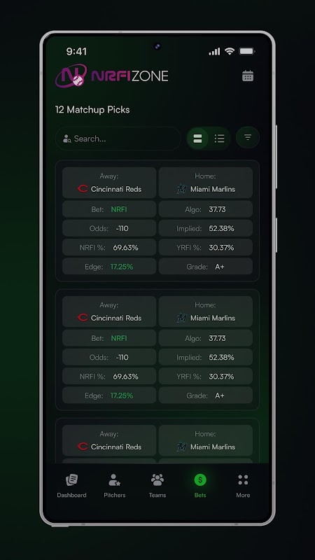 获取实时NRFI/YRFI预测模型、统计数据、比赛分析和每日趋势——所有信息尽在一个简洁、数据驱动且精准的应用程序中。