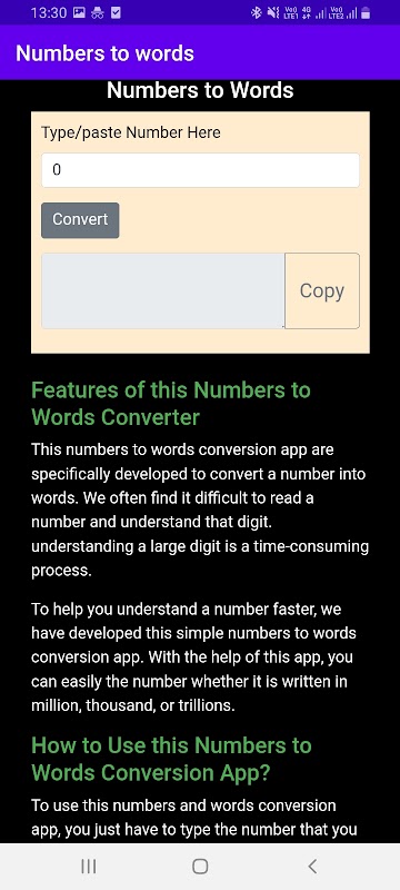 要使用此数字到单词转换应用程序,您只需输入数字并点击转换为单词按钮即可。您可以键入该数字或粘贴该数字。点击按钮后,您将收到该特定数字的字值。