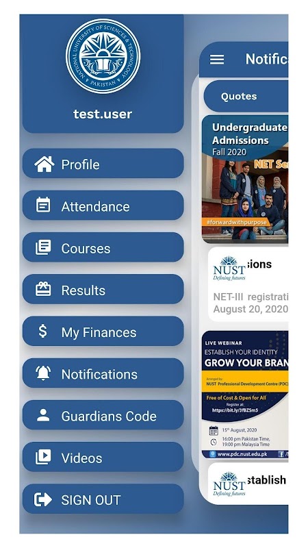 NUST developed Official Mobile Application to facilitate student, parents and employees to stay well informed regarding their academic activities. The Application mainly includes three modules Student, Employee and Parent to view their Profile, Attendance, Exam Results, Payroll and Notifications.