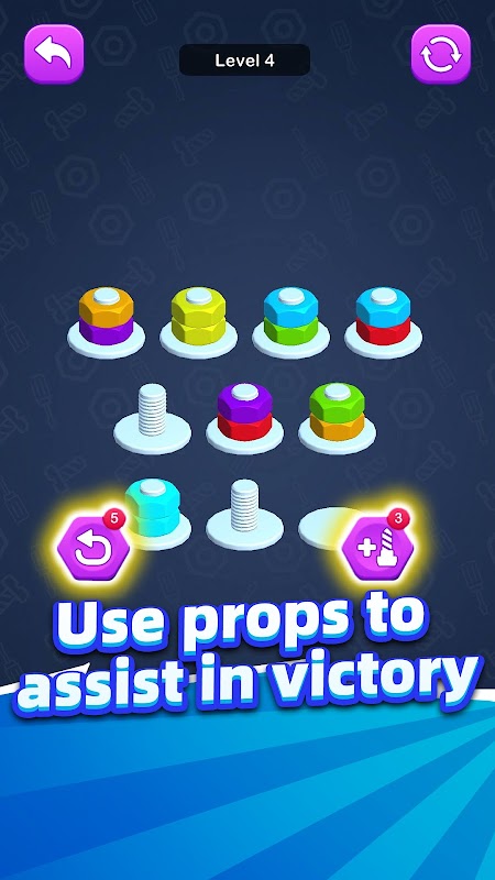 丰富多彩的挑战:数千个充满彩色螺栓的关卡。颜色排序游戏的每个级别难度递增,提供令人满意且循序渐进的颜色匹配挑战。