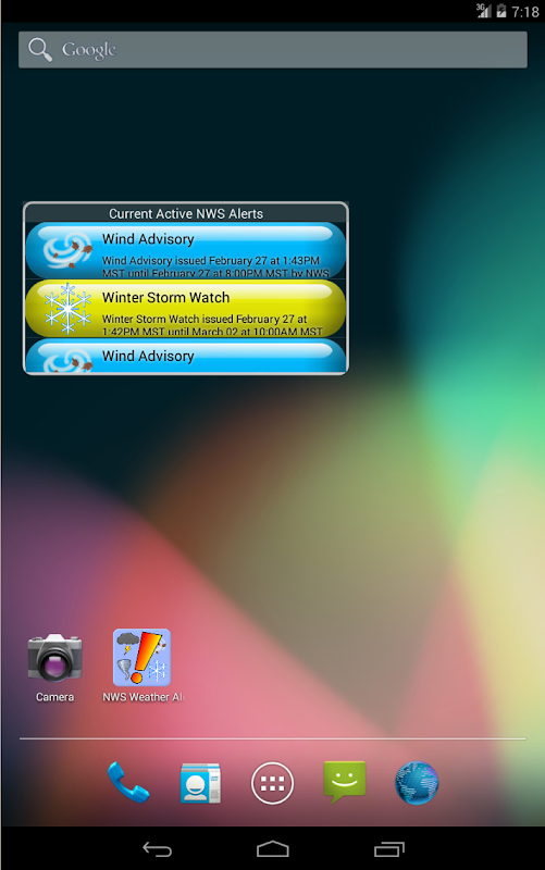 您可以选择美国(或整个美国)内的一个县或州,它将在小部件上显示该地区所有当前天气警报的列表。如果超出范围,列表会滚动,您可以点击警报以打开警报的全文。有一个随附的应用程序,可用于配置您想要的区域,并在您真的好奇时显示原始提要数据(尽管该部分主要用于调试,并且现在可能会消失,因为它一切正常) )。它目前不发出声音警报(或任何警报),但这可能很快就会出现。