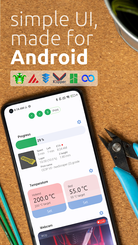 该应用支持 OctoPrint、Klipper(Moonraker、Fluidd、Mainsail)、Bambu Lab 和 Elegoo Centauri。