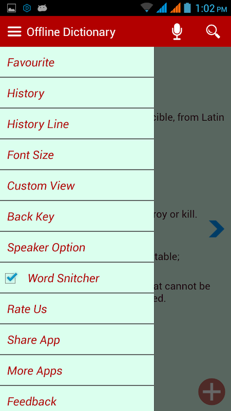 * WORD-SNITCHER : Its a new feature that was added in this dictionary. It work globally, whenever a word coppied on clipboard, a floating widget is appera on the bottom of screen with its meaning so that there is no need to open the dictionary to see its meaning.