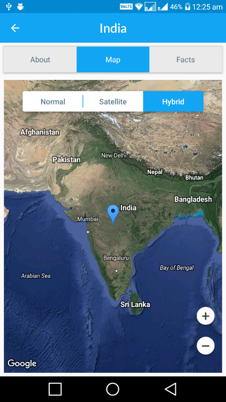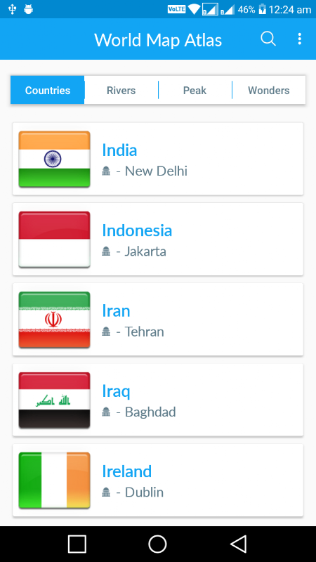 此全球地图显示了具有政治边界的所有国家/地区的名称。如果您单击国家/地区,则该应用会显示与该特定国家/地区有关的信息。您可以看到每个国家的普通视图和卫星视图。另外,了解大写字母和旗帜。
