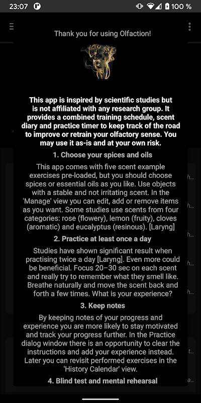 此应用程序受科学研究的启发,但不隶属于任何研究小组。它提供了综合的培训计划,香水日记和练习计时器,以跟踪道路,以改善或重新训练您的嗅觉。您可以原样使用它,而没有任何保证。