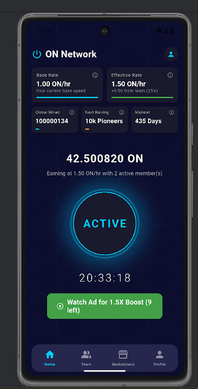 ON Network 由用户驱动。随着您团队的壮大,您的收益也会提升!使用您的专属邀请码邀请您的朋友和值得信赖的社区成员加入您的网络。您的团队活跃成员越多,您的收益就越快!