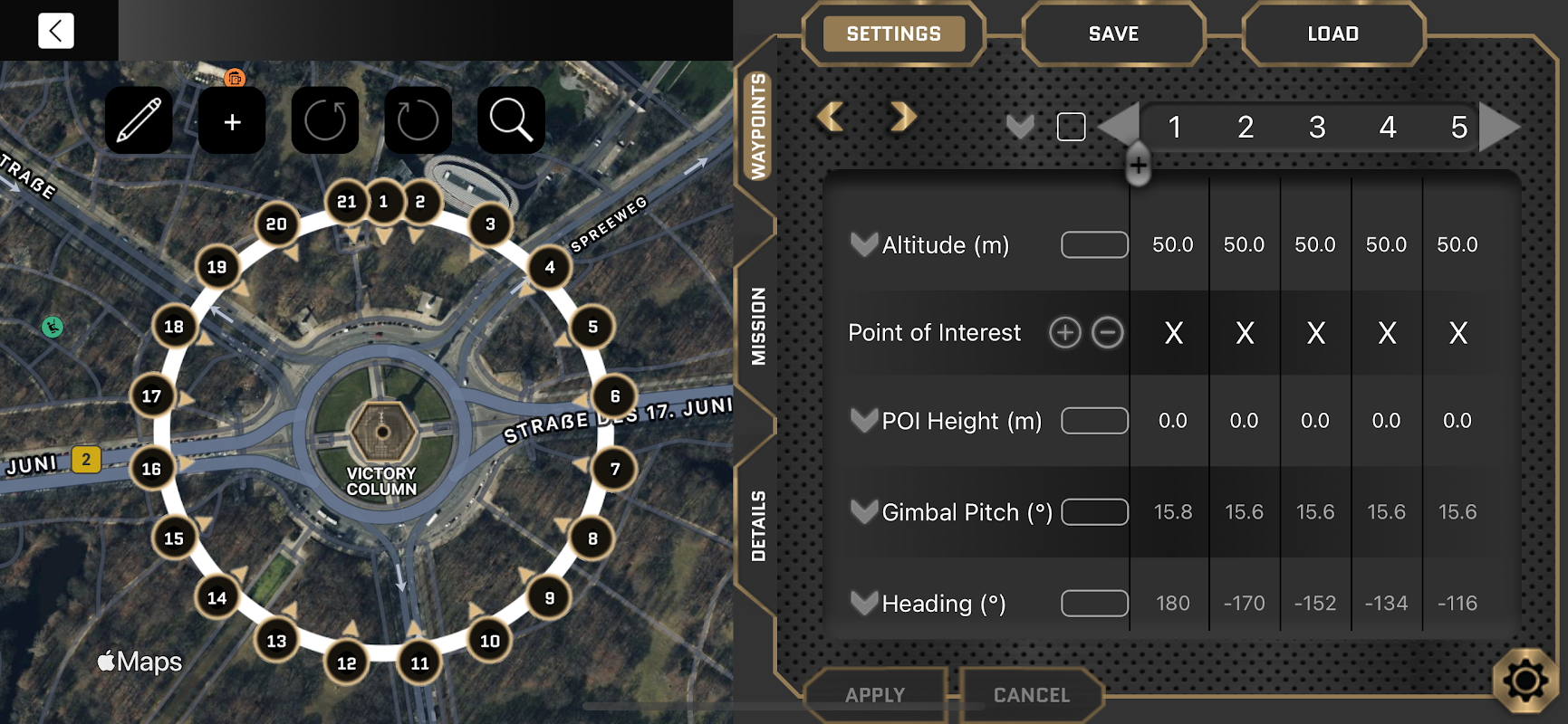 该应用程序旨在让您更轻松、更快速、更精准地规划无人机飞行。它支持选择或绘制多种形状。此外,您还可以对各个航点进行不同的设置,例如飞行高度、相机角度和兴趣点(相机应瞄准的点)。