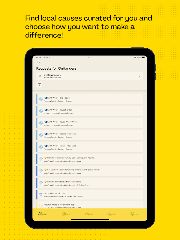 为您所做的每一件好事赚取英雄点数,攀登排行榜,并向您的朋友炫耀! OnHand 应用程序具有自动志愿者和二氧化碳减排跟踪功能,并通过影响页面大声宣传您所做的善事。