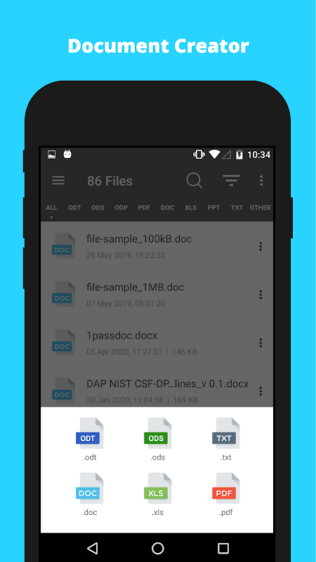 Open Office support: ODT, ODS, ODP, Word viewer, Excel viewer, Powerpoint viewer, PDF