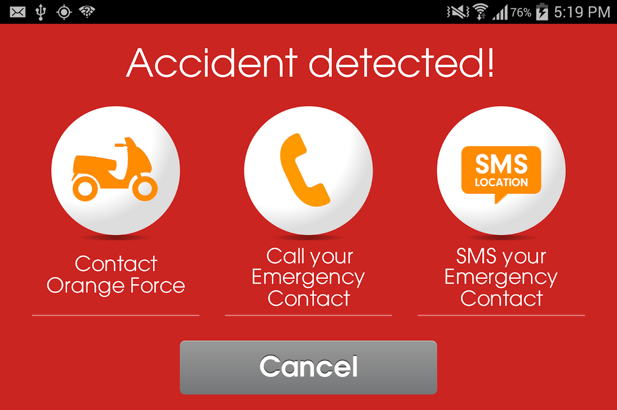 Tap on accident detected icon to contact Orange Force, our 24/7 accident response team (for NTUC Income Motor Insurance Policyholders only), or make calls and send location SMS to pre-set emergency contacts.