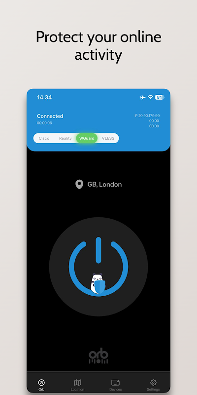 - 强大的安全协议:OrbVPN 采用先进的加密标准 (AES-256) 和安全隧道协议(如 Cisco、V2ray 和 Wireguard)来保护用户数据并保持在线匿名性。