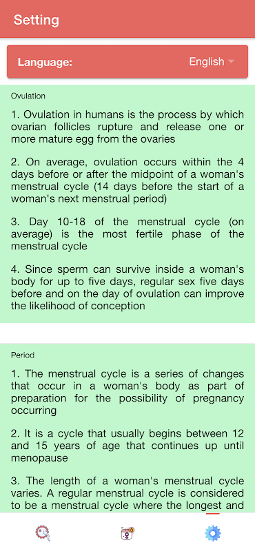 “排卵和月经追踪器:生育日历”还具有月经追踪器功能。此功能使您可以确定下一个时期。时期是发生出血和分泌物的日子。在此功能中,“排卵和经期跟踪器:生育日历”还将确定最可能的排卵日,即女性最有可能排卵的日子。