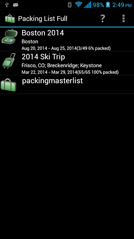 装箱单可帮助您创建和维护装箱单。它不仅允许用户从头开始创建列表,还允许您从现有列表生成列表。该应用程序附带多个预加载的装箱主清单。您只需打开主列表(或任何现有列表)即可。单击“生成列表/批量更改”菜单项。检查您旅行所需的物品,您将立即准备好新的装箱单。