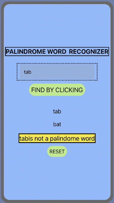 这个应用程序会让我们知道给定的单词是回文还是不是回文。 • “它会生成回文或非回文的单词”