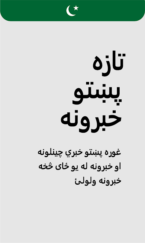 您可以轻松阅读所有著名新闻频道和报纸上的普什图语新闻。阅读来自 BBC、TRT、DW、Pars Today、APP、VOA、Zhwandoon、Tolo、阿富汗伊斯兰、Pajhwok、Taand 等的最新消息。