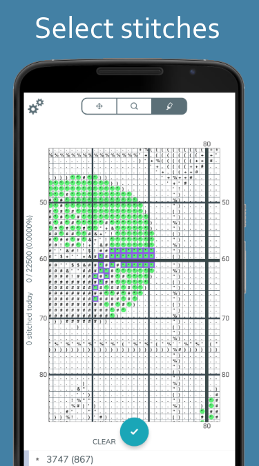 标记完成的针迹。通过水平,垂直甚至对角线滑动轻松选择。也可以标记整个10 x 10正方形。如果您导入的图表中已经包含注释,我们将尝试将其作为当前进度导入。成品针脚以彩色显示,可轻松浏览并与针脚进行比较。