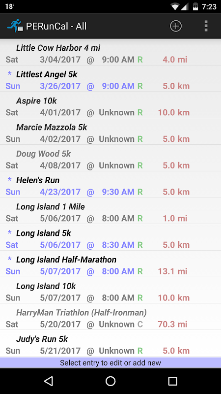 This app helps you manage a calendar/schedule of your upcoming running, biking and swimming events. It's perfect for runners and triathletes. Keep track of event names, dates, locations, distances etc. Can handle 5k's, 10k's, Half-marathons, Full Marathons, Duathlons, Triathlons, or just about any event type. Mark events that you've "registered for" vs. "planning on attending" vs. "just thinking about". When the event is over, you can record your time and placement results. Data can be backed up to DropBox, which also allows sharing of data with other devices. A free Windows app is also available for download, to allow you to access data from your PC.