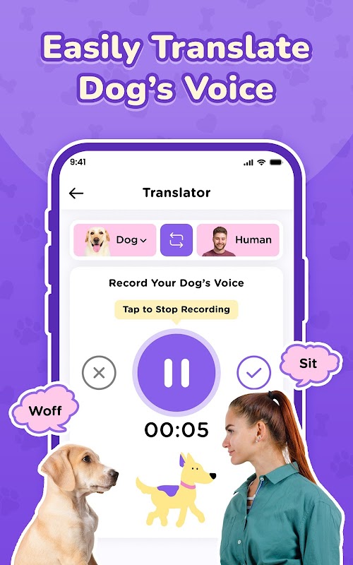 ✅ 宠物声音翻译器 – Fake 将吠叫、喵喵声和宠物声音翻译成“人类语言”。