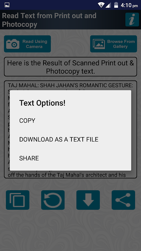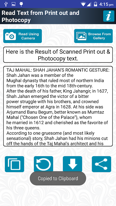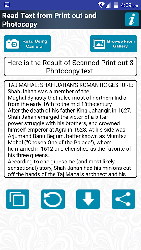 This is a Free Android App to Read & Save Text of Photostat Print out Photocopy Documents and Picture image OCR Reading in editable format. App that allows you to read Text from Photostat Printout Papers and Photos and Recognize text of pictures to Convert text written in any image to Editable text format directly by optical character recognition OCR Scan using Camera of your Android Mobile Phone.