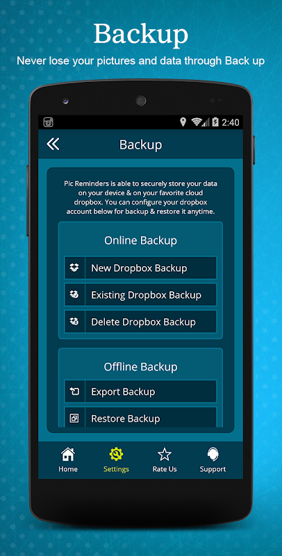 你可以把你的整个应用程序的备份您最喜爱的云谷歌驱动器和Dropbox上。在您的设备丢失的情况下,你可以简单地从云计算,你已存储检索您的图像和事件提醒还原备份