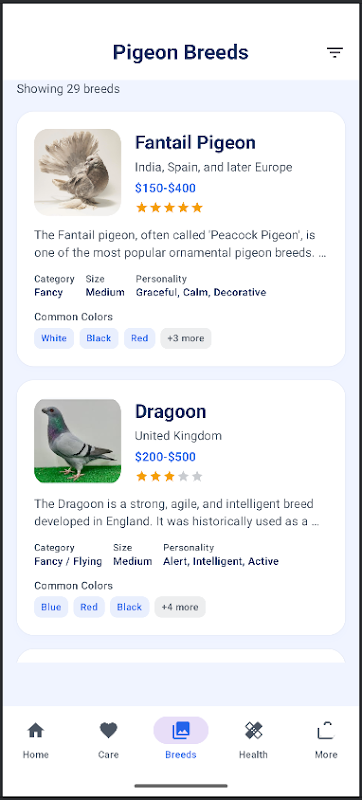 🐦 丰富的鸽子品种数据库:探索数百个鸽子品种,每个品种都配有专业的描述、图片以及关于其起源、外观和性格的详细信息。