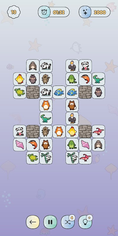 Find all matching animals, connect in maximum 3 straight lines to clear them.
