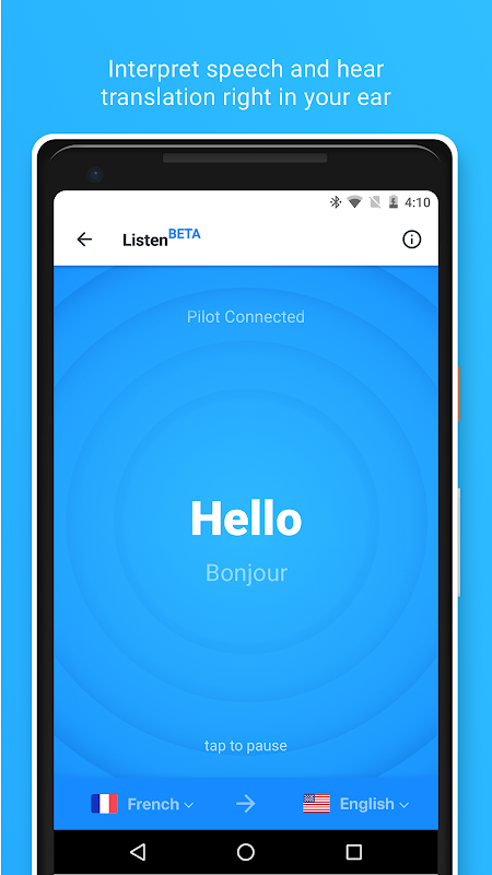 •聆听模式:使用Pilot耳机将您的语音以你需要的语言翻译。