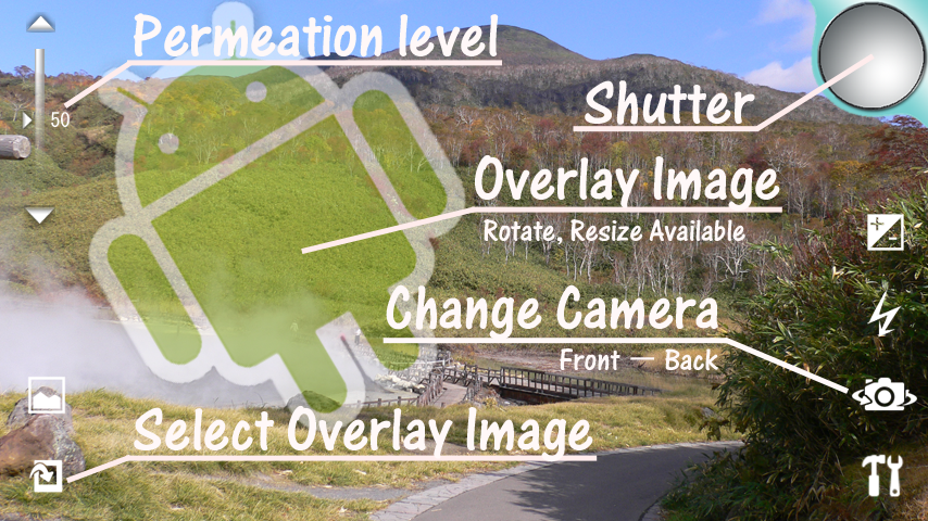 此应用程序是简单的摄像头,能够利用图像叠加使用无人值守模式的图片。(当快门音的禁用设置)