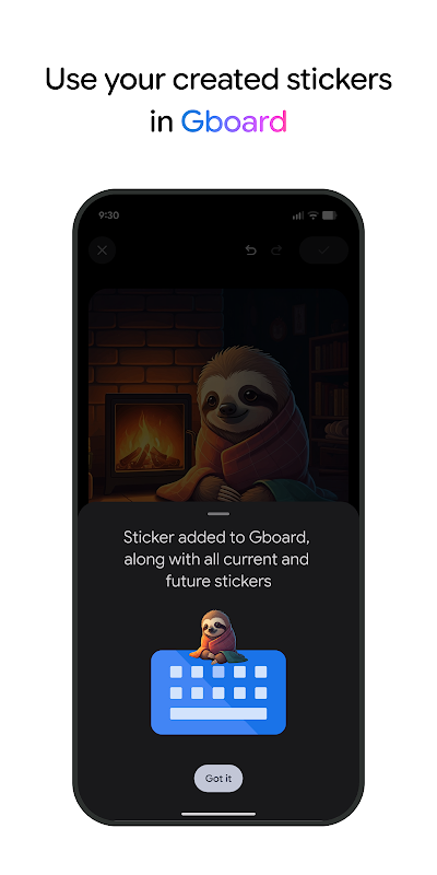 ● 只需描述即可添加或创建贴纸,贴纸会自动保存到您的 Studio 项目和 Google 键盘 (Gboard) 中。