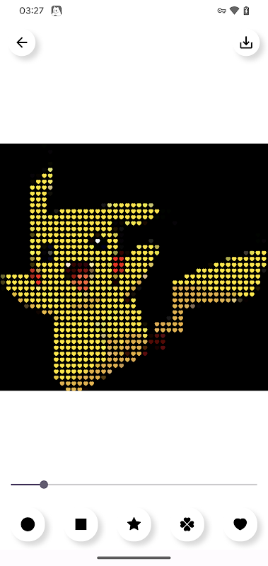 使用图形拼接成你的图片,选择多种图形如:爱心、星星、月亮等拼成你的图片,并且可以调节图形的大小,导出和分享你的图片。
